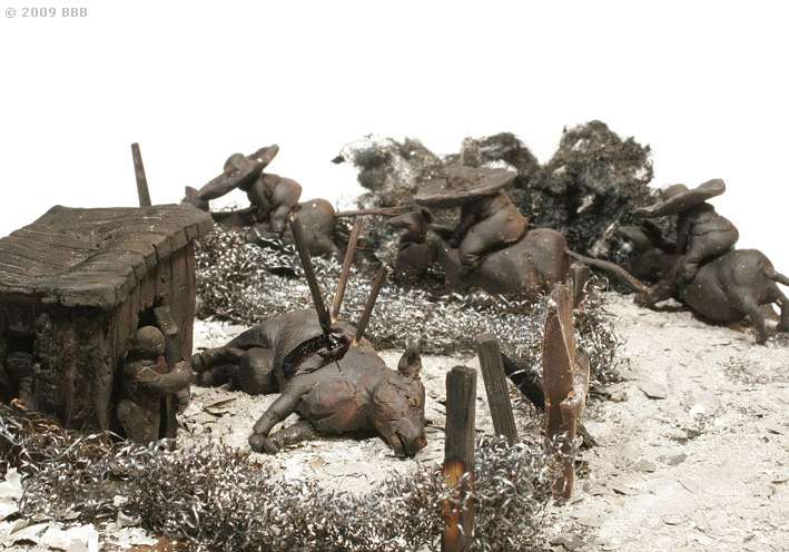 Unter dem Titel „Der Auswanderer“ zeigt der Hamburger Künstler Martin Nill noch bis zum 28. März ausgesuchte Dioramen und Kleinskulpturen aus der umfangreichen Sammlung des NILLMUSEUMs. Die Dioramen beinhalten figürliche Darstellungen nach Familienfotos oder von Schnappschüssen von alltäglichen Situationen, die dreidimensional nachgebaut und dann bis zu einem gewissen Grad verbrannt wurden. Die freistehenden Skulpturen stellen verbrannte Landschaften und Raumsituationen dar, mit teilweise literarischen bzw. filmischen Bezügen.