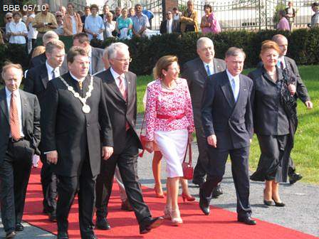 v.l.: Brühls Bürgermeister Michael Kreuzberg, Ministerpräsident von NRW, Jürgen Rüttgers, Bundespräsident Horst Köhler mit Gattin Eva Luise Köhler und Hans-Peter Krämer, Kreissparkasse Köln schreiten zur Eröffnung des Max Ernst Museums.